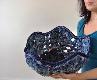 En korg i spröd blomform blir liksom inte densamma om den virkas i tjocka, fransiga jeansremsor. Den blir så mycket bättre!