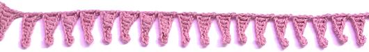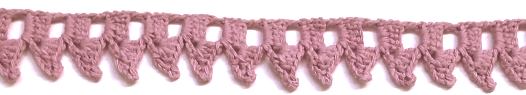 Denna spetskant eller hyllremsa är strösslad med picoter. Dem virkar du på detta sätt: Virka 5 lm. För in virknålen i den främre maskbågen på den fm du virkade senast + den lodrätta tråden som ligger längst fram under den främre maskbågen på fastmaskan. Gör en smygmaska. Japp, det är 1 picot.